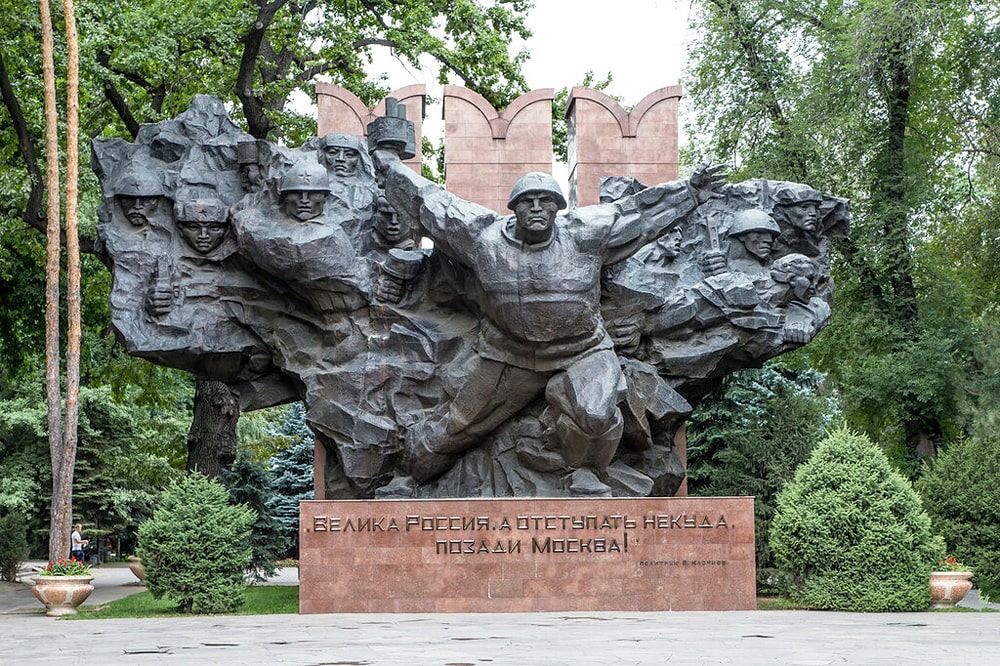 - Скульптурную группу из шести монументальных фигур бойцов высотой 10 метров, олицетворяющих представителей различных национальностей, ибо 316-я дивизия создавалась в Казахстане и Киргизии. В её составе – весь многонациональный Советский Союз.