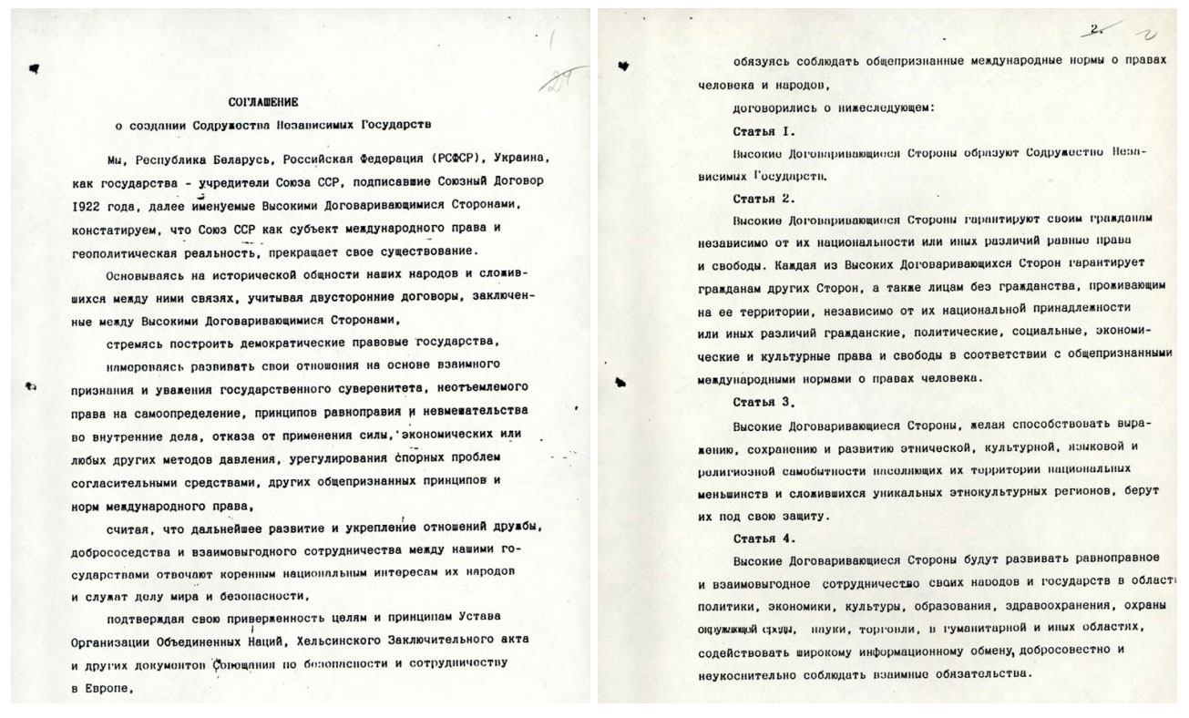 Основой для переговоров, которые перенесли из Минска в государственную охотничью резиденцию «Вискули» в центре Беловежской пущи, стали, по воспоминаниям Станислава Шушкевича, заготовки договора, разработанные еще в феврале 1991 года, но не использованные в связи с итогами всесоюзного референдума. Теперь же они были извлечены на свет и представлены российской стороной сначала делегации Белоруссии, а затем и Украины. Но если белорусская сторона готова была подписать этот документ, то украинская, для которой важнейшим вопросом переговоров было предоставление республике полной и всеобъемлющей независимости, настояла на переработке текста документа. Как вспоминал Леонид Кравчук, межгосударственная группа специалистов занималась работой над новым проектом документа всю ночь, и утром 8 декабря он был представлен трем президентам. Глава Украины, по его словам, «подписал документ быстро, без каких-либо обсуждений и согласований», и так же оперативно на нем поставили подписи два других президента — Ельцин и Шушкевич.