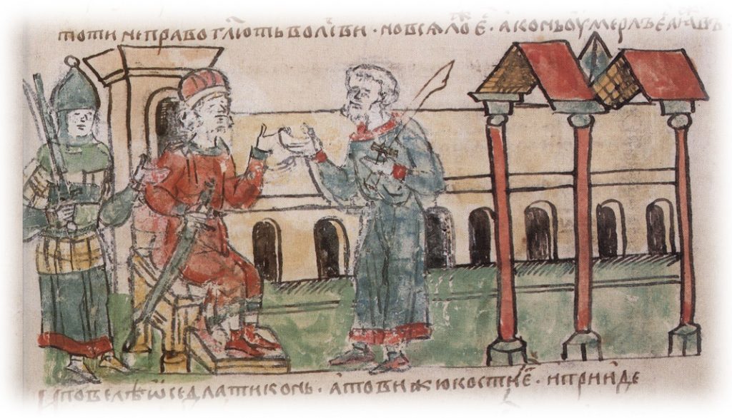 Рюрик разрешает Аскольду и Диру отправиться с походом на Царьград. Радзивилловская летопись. Миниатюра.