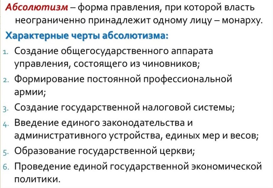Апофеозом абсолютизма в России можно считать реформы Петра Великого, когда им была учреждена разветвлённая чиновничья система коллегий, охватывавшая все сферы жизнедеятельности государства. Итогом данной деятельности стало подчинение власти императора и духовно-религиозной сферы, когда был упразднён православный патриархат, и вместо него создан синод во главе с государственным чиновником.