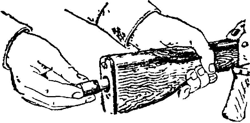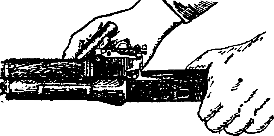 Оттянуть конец шомпола от ствола так, чтобы его головка вышла из-под упора на основание мушки, и вынуть шомпол. При затруднительном отделении шомпола разрешается пользоваться выколоткой которую следует вставить в отверстие головки шомпола, оттянуть от ствола конец шомпола и вынуть его.