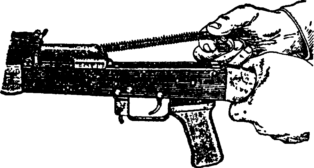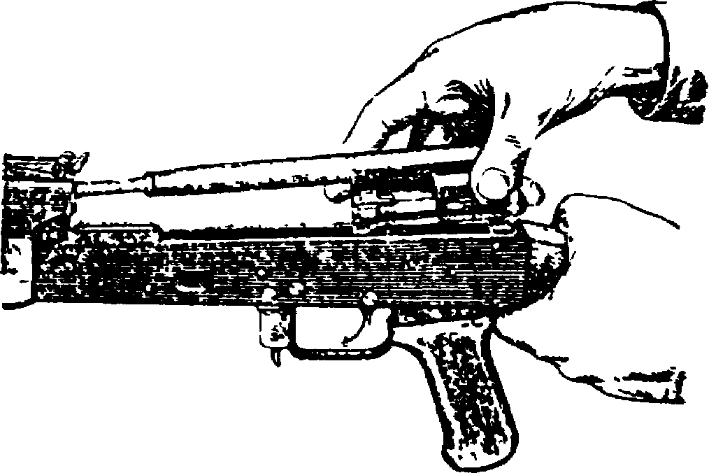 Взять затворную раму в левую руку затвором кверху; правой рукой отвести затвор назад, повернуть его так. чтобы ведущий выступ затвора вышел из фигурного выреза затворной рамы, и вывести затвор вперед.