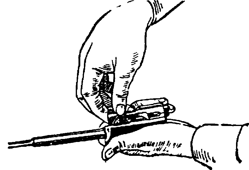Утопить пальцем правой руки крышку гнезда так, чтобы пенал под действием пружины вышел из гнезда: раскрыть пенал и вынуть из него протирку, ершик, отвертку и выколотку.