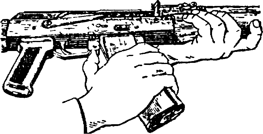 Удерживая автомат левой рукой за шейку приклада или цевье, правой рукой обхватить магазин: нажимая большим пальцем на защелку. подать нижнюю часть магазина вперед и отделить его. После этого проверить, нет ли патрона в патроннике, для чего опустить переводчик вниз. поставив его в положение «АВ» или «ОД»; отвести рукоятку затворной рамы назад, осмотреть патронник, отпустить рукоятку затворной рамы и спустить курок с боевого взвода.