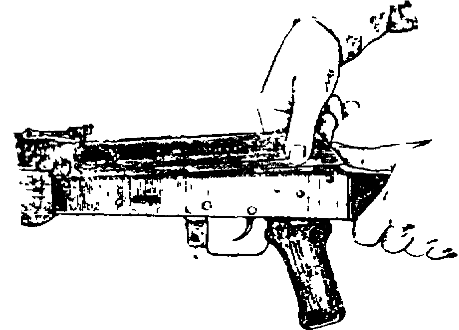 Левой рукой обхватить шейку приклада, большим пальцем этой руки нажать на выступ направляющего стержня возвратного механизма, правой рукой приподнять вверх заднюю часть крышки ствольной коробки и отделить её.