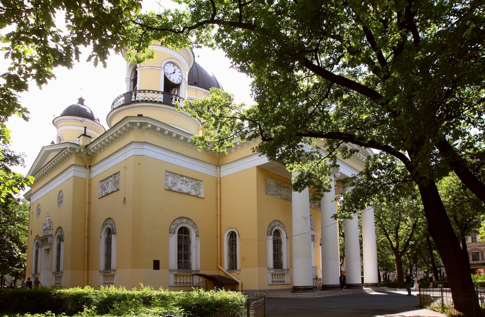 Внешне собор строг, торжественен и лаконичен. Расположенный рядом с Литейным проспектом, где раньше находились казармы преображенцев, храм построен в виде двадцатичетырехгранного креста.