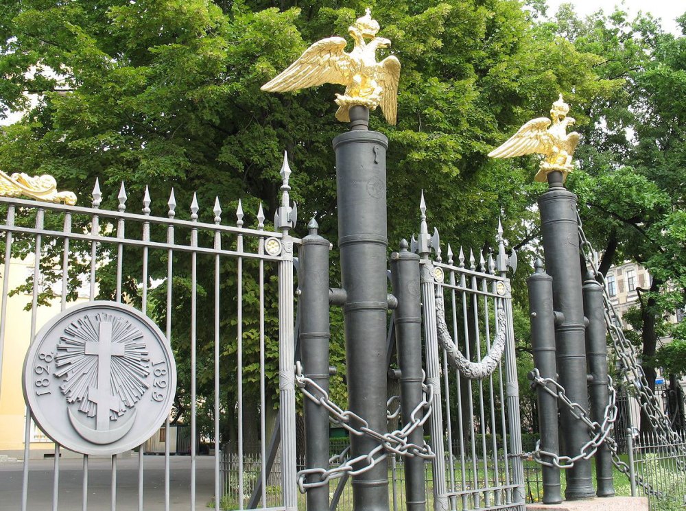 Средний ствол каждого основания украшает позолоченный двуглавый орел с короной. Группы орудийных стволов соединены массивными чугунными цепями.
