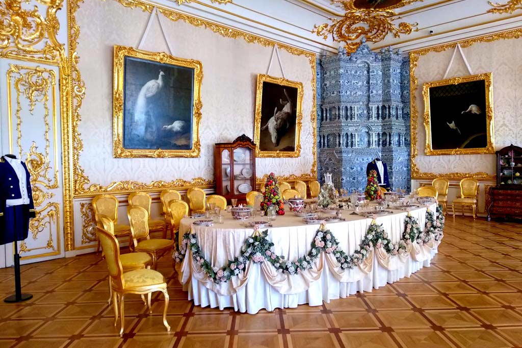 После Большого зала туристов проводят через Кавалерийскую столовую, созданную по проекту Растрелли. В этом зале доминирует позолоченный орнамент из раковин и цветов. Здесь стоят сервированные столы с фарфоровой посудой конца XVIII века.