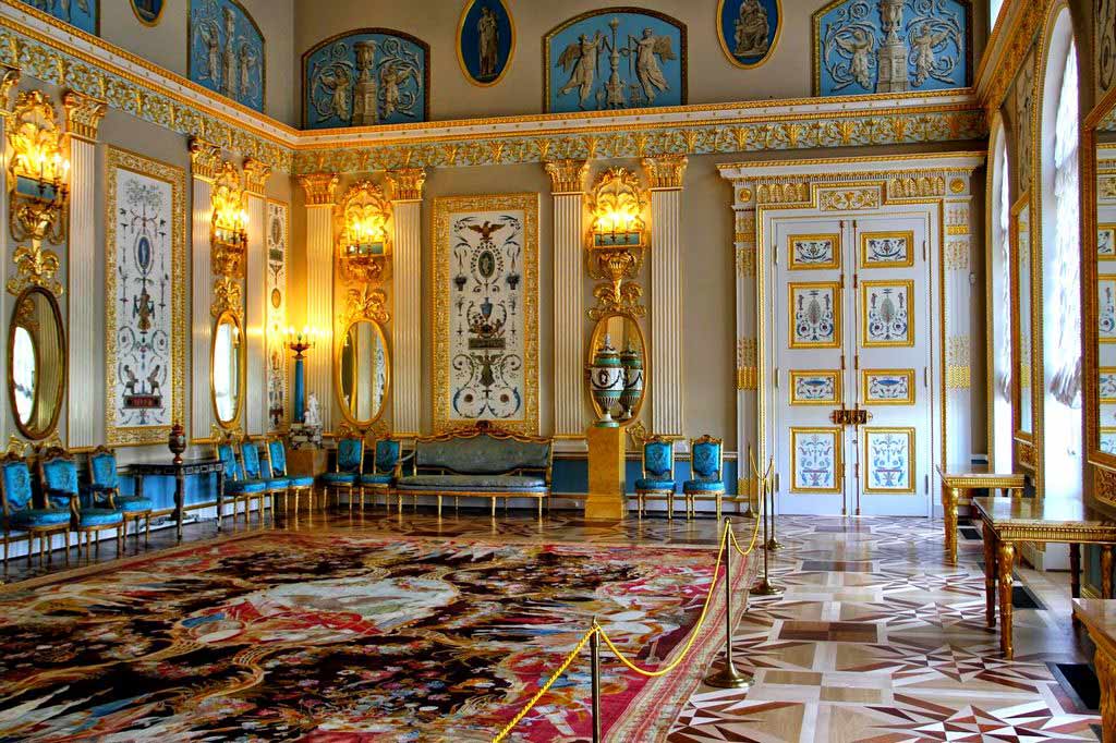 Одним из самых эффектных помещений дворца считают личные апартаменты Екатерины II — Арабесковый зал. Покои украшены зеркалами в золоченых рамах, вычурной лепниной, парадными портретами хозяйки и ее приближенных. На потолке изображены сюжеты из любимых императрицей античных мифов.