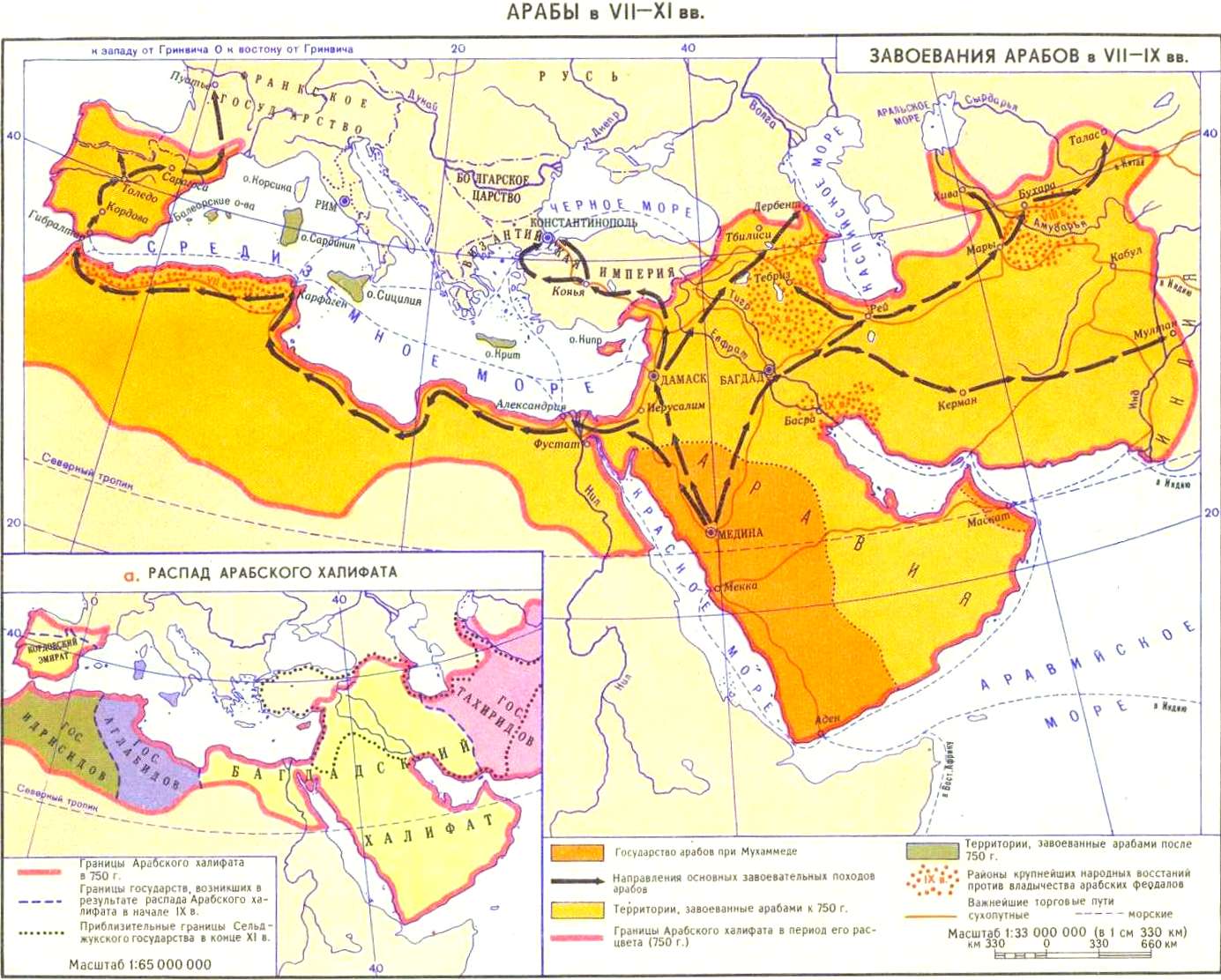 К 750 г. владения халифата (Арабского государства) раскинулись от берегов Атлантического океана до границ Индии и Китая, Столицей халифата первоначально была Мекка, затем Дамаск в Сирии. Причиной побед стал, с одной стороны, ислам, сплотивший арабов, а с другой стороны, то, что главные противники арабов — Византия и Персидское царство — были давними соперниками и истощили друг друга во взаимных войнах, население было разорено налогами и не оказывало арабам серьезного сопротивления. В ходе завоеваний ислам превратился в мировую религию.