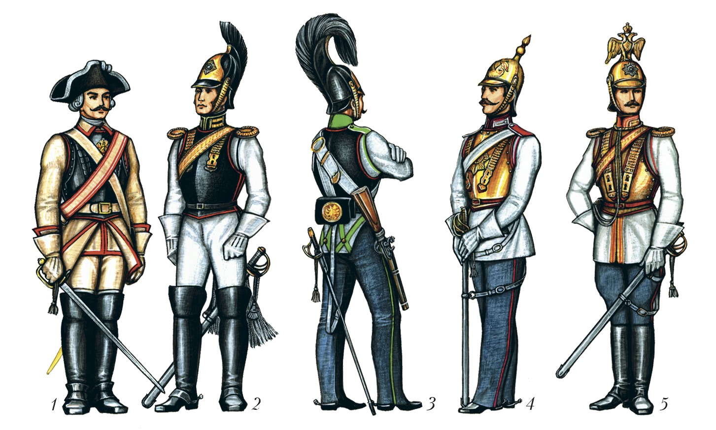 Первоначально гвардейские гренадеры отличались богатыми шапками из медвежьего меха, но после 1707 года их заменили на кожаные каски с медным налобником и страусовым пером. Эти шапки превратились в настоящий символ петровской гвардии и продержались до 1796 года.