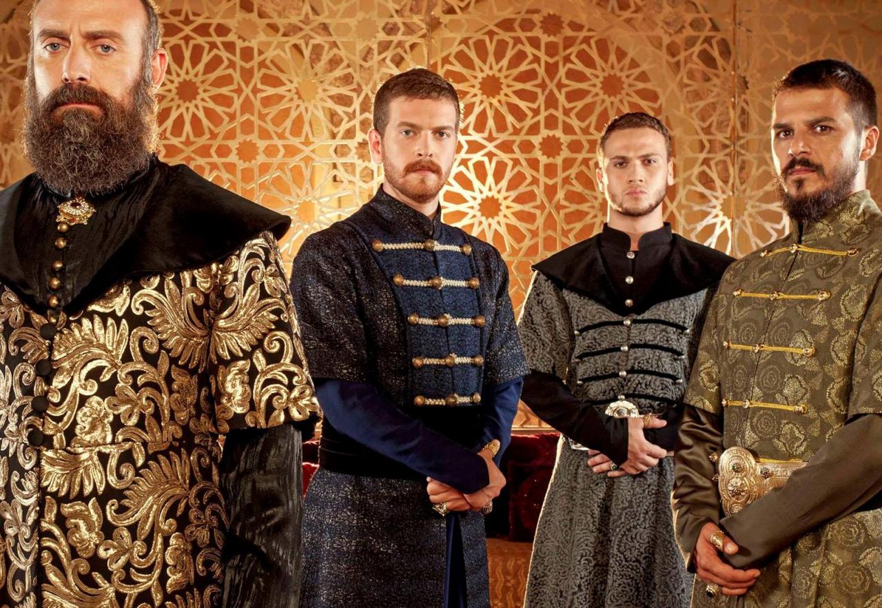 Султан Сулейман с сыновьями: шехзаде Мустафа, шехзаде Селим, шехзаде Баязид. Актеры: Халит Эргенч, Мехмет Гюнсюр, Энгин Озтюрк, Арас Булут Ийнемли.