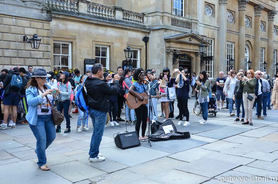 Термы и аббатство стоят на одной площади, небольшой, но очень многолюдной. Здесь поют уличные музыканты, здесь же толпится очередь в Римские термы (в которых сейчас устроен музей).