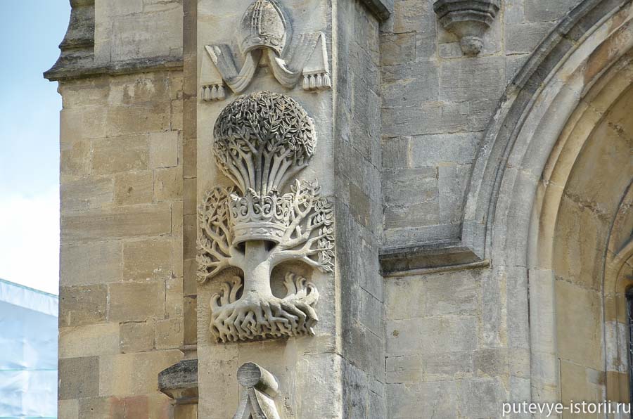 в вырезанных из камня оливе с короной обыгрывается фамилия одного из епископов аббатства