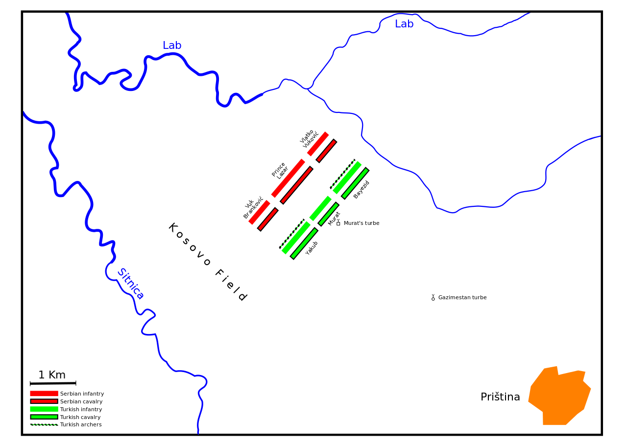 На этом поле сойдутся в битве в 1389 году две стороны, каждая из которых понесет большие потери. Численность войск с обоих сторон точно неизвестна. Чем дальше от того времени, тем меньше приводятся цифры, на настоящий момент считается, что со стороны сербов было от 10 до 33 тысяч, со стороны турок от 15 до 40 тысяч. Хотя в более раннем эпосе о Косовом поле есть такие строки о славянках силах: