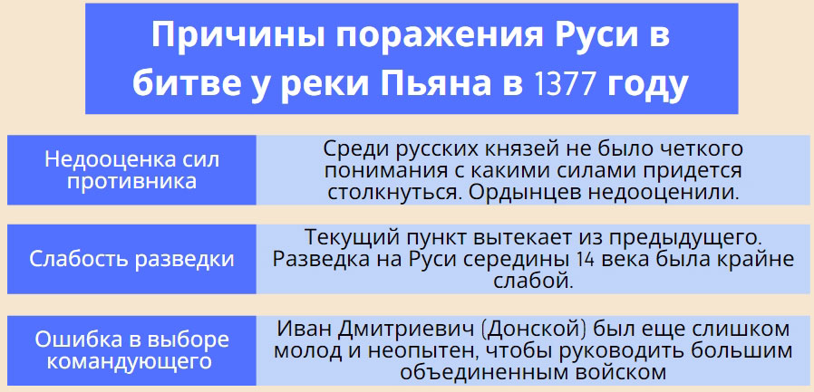 Несмотря на сокрушительное поражение, сражение на Пьяне имело и положительные последствия – Дмитрий Донской сумел извлечь урок из совершенных ошибок и в 1380 году одержал блистательную победу на Куликовом поле.