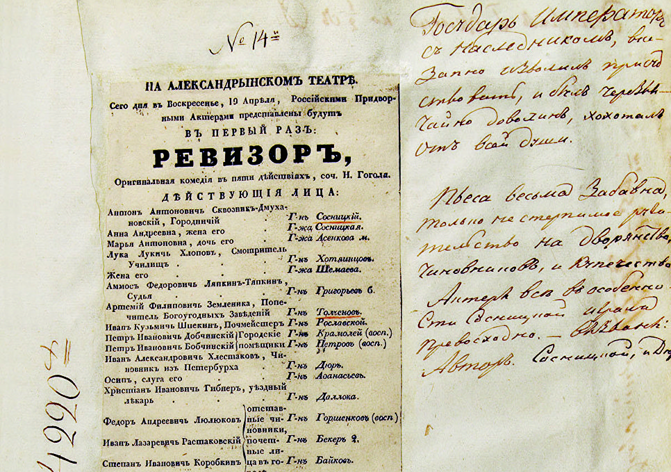Программка первого представления пьесы «Ревизор», 1836 г. Фото: Александринский театр