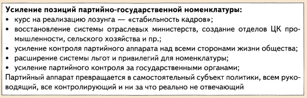 С 1964 году в страну с приходом Брежнева вернулись консервативные тенденции и постепенно нарастающий негатив как в экономике СССР, так и в социально-духовной жизни общества. Брежневский партийный аппарат видел в своем лидере единого защитника системы, поэтому в правительстве отвергались любые реформы с целью сохранения прежнего режима власти, наделенной широкими привилегиями. Страна формально вернулась к «ленинским» принципам коллективного руководства, партийный аппарат страны полностью подчинил себе государственный, все министерства стали обычными исполнителями решений партии, а в высшем руководстве не осталось беспартийных лидеров.