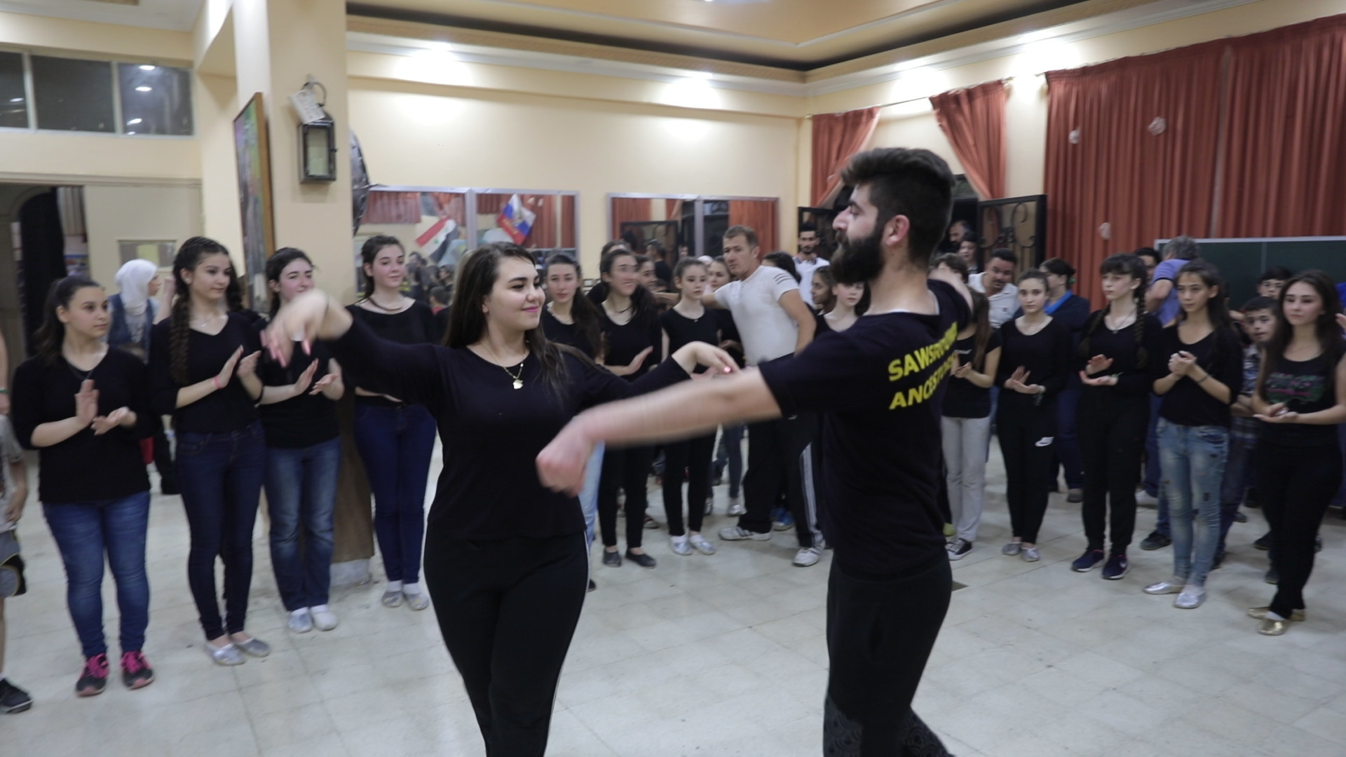 Несмотря на регулярные обстрелы, на протяжении всей войны в Куцее работал Центр национальной черкесской культуры. Здесь даже есть кружок кавказских танцев. Его ведут два брата-кабардинца в свободное от службы в Сирийской арабской армии время. Мы напросились на вечернее занятие, чтобы посмотреть, как танцуют лезгинку на сирийском фронте.