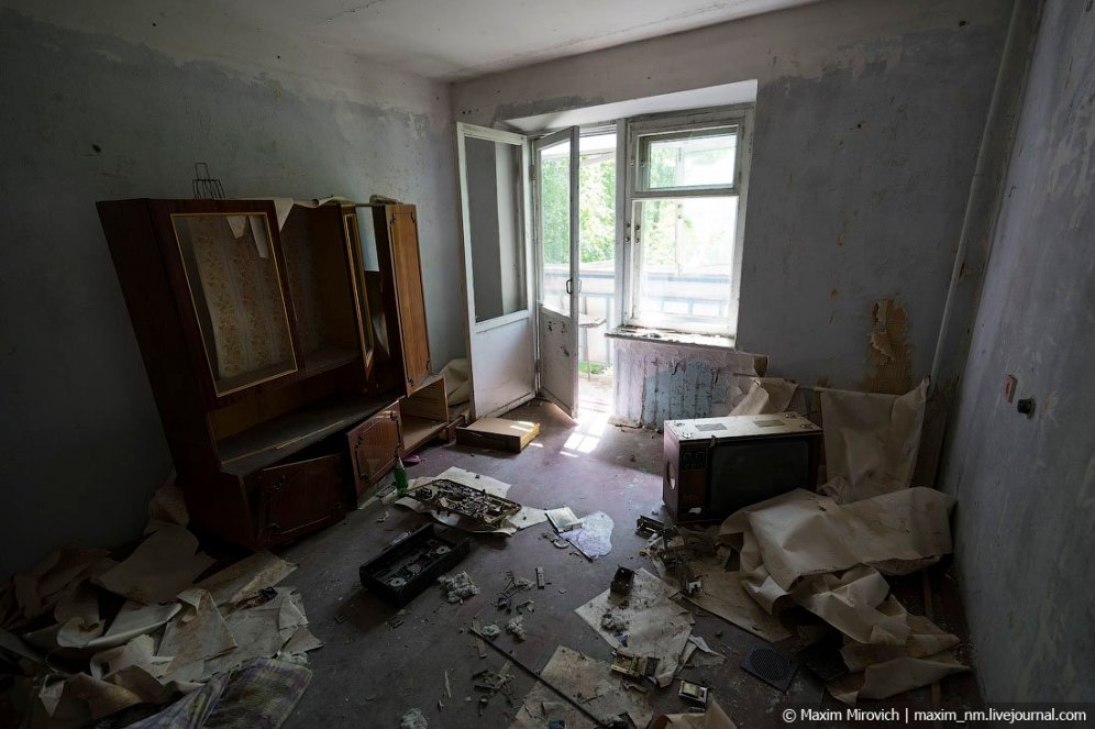 В Припяти совсем не осталось нетронутых квартир. Осенью 1986 года по домам ходили дезинфекторы, которые выбрасывали холодильники с едой, чтобы не допустить эпидемии. Несколько позже в окна полетела и мебель — ее выбрасывали прямо в кузова автомобилей и увозили в могильники.