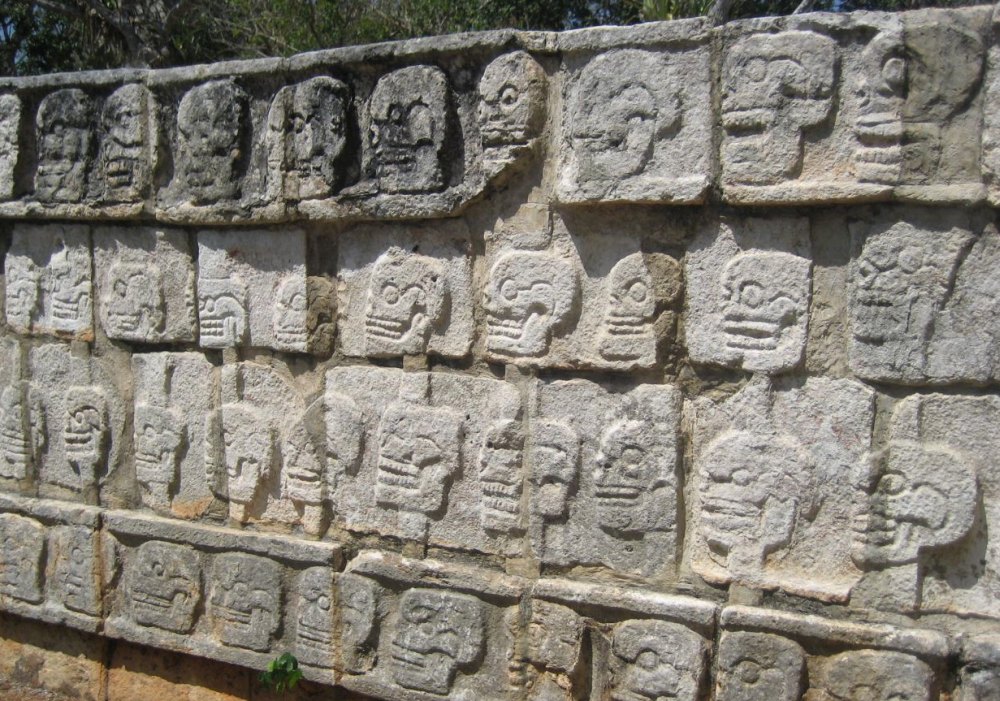 Справа от поля для игры в мяч – Стена черепов, Т-образная платформа, стены которой покрыты рельефными изображениями черепов На каменную стену развешивали черепа принесенных в жертву людей, а на специальный шест насаживали в ряд отрубленные головы врагов.
