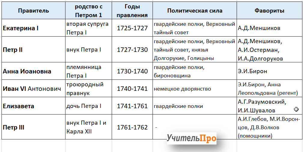 В следующей хронологической таблице представлены все шесть русских правителей, время правления которых по истории связано с эпохой дворцовых переворотов. Первая строка отвечает на вопрос, кто из правителей открыл рассматриваемый промежуток в политической жизни России в 18 веке – Екатерина I. Далее следуют другие монархи в хронологическом порядке. Кроме того, указывается с помощью каких сил и придворных группировок, каждый из них пришёл к власти.