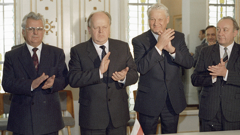 - Президент Украины Леонид Кравчук, председатель Верховного Совета Белоруссии Станислав Шушкевич и Президент России Борис Ельцин после подписания Соглашения о создании СНГ в Беловежской пуще