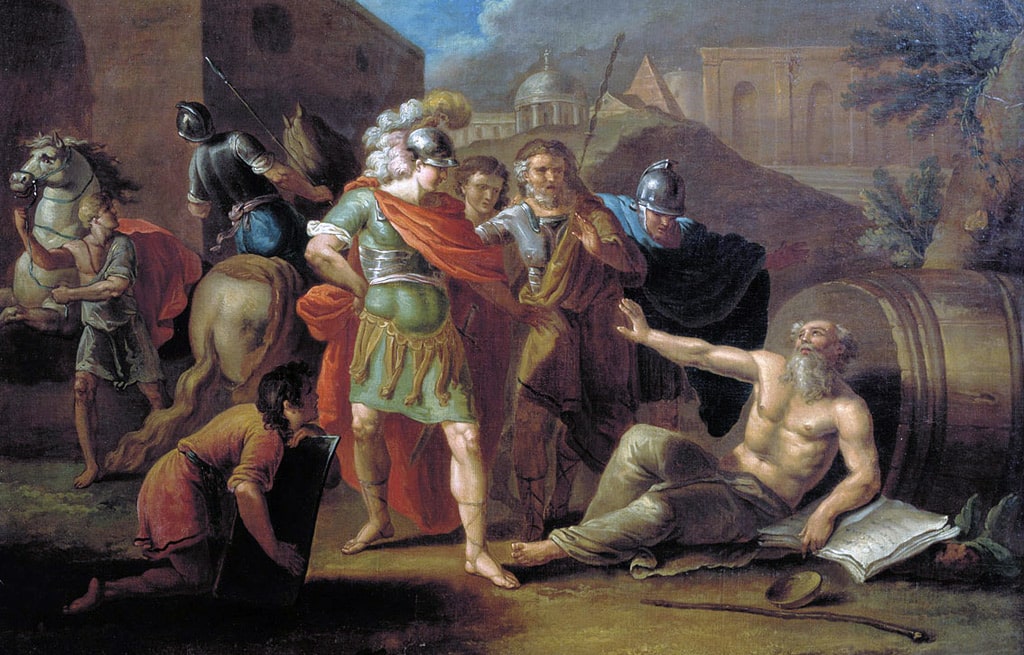 Плутарх рассказывает, что Александр долго ждал, пока сам Диоген придет к нему выразить свое почтение, но тот спокойно проводил время у себя. Тогда полководец был вынужден самостоятельно посетить философа.