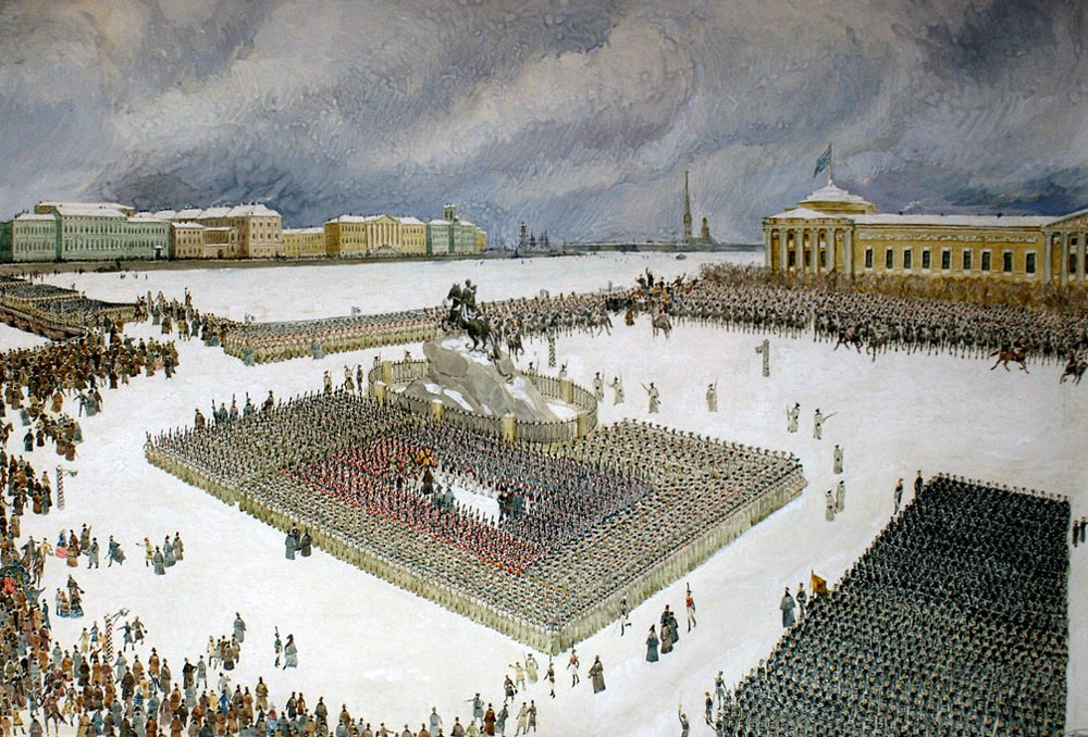 — 14 декабря 1825 года часть Московского гвардейского полка, часть гвардейского гренадерского полка и весь гвардейский морской экипаж (всего около двух тысяч человек) отказались дать присягу. С распущенными знаменами в солдаты пришли на Сенатскую площадь и построились в каре. «Диктатор» князь Трубецкой на площадь не явился, и напрасно его искали; всем распоряжался Иван Пущин, частью — Рылеев. «Каре мятежников стояло в бездействии в продолжение значительной части дня. Великий князь Николай, собиравший около себя полки, оставшиеся ему верными и расположенные у Зимнего дворца, также оставался в бездействии. Наконец, Николая уговорили в необходимости кончить дело до наступления ночи, в противном случае другая декабрьская ночь даст мятежникам возможность действовать. Приехавший только что из Варшавы генерал Толь подступил к Николаю: «Государь, прикажите площадь очистить картечью или откажитесь от престола». Дали холостой залп, он не подействовал; выстрелили картечью — каре рассеялось; второй залп увеличил число трупов. Этим кончилось движение 14 декабря»* — 29 декабря 1825 года началось восстание Черниговского полка, возглавляемое С. Муравьевым-Апостолом и М. Бестужевым-Рюминым. 3 января оно было подавлено. 121 участник тайных обществ были осуждены разным образом: от казни до ссылки в Сибирь на каторжные работы, на поселение, разжалования в солдаты, лишения чинов, дворянства.Пестель, Рылеев, Сергей Муравьёв-Апостол, Бестужев-Рюмин и Каховский были приговорены к смерти и повешены 13 июля по ст. ст. 1826 года в Петропавловской крепости
