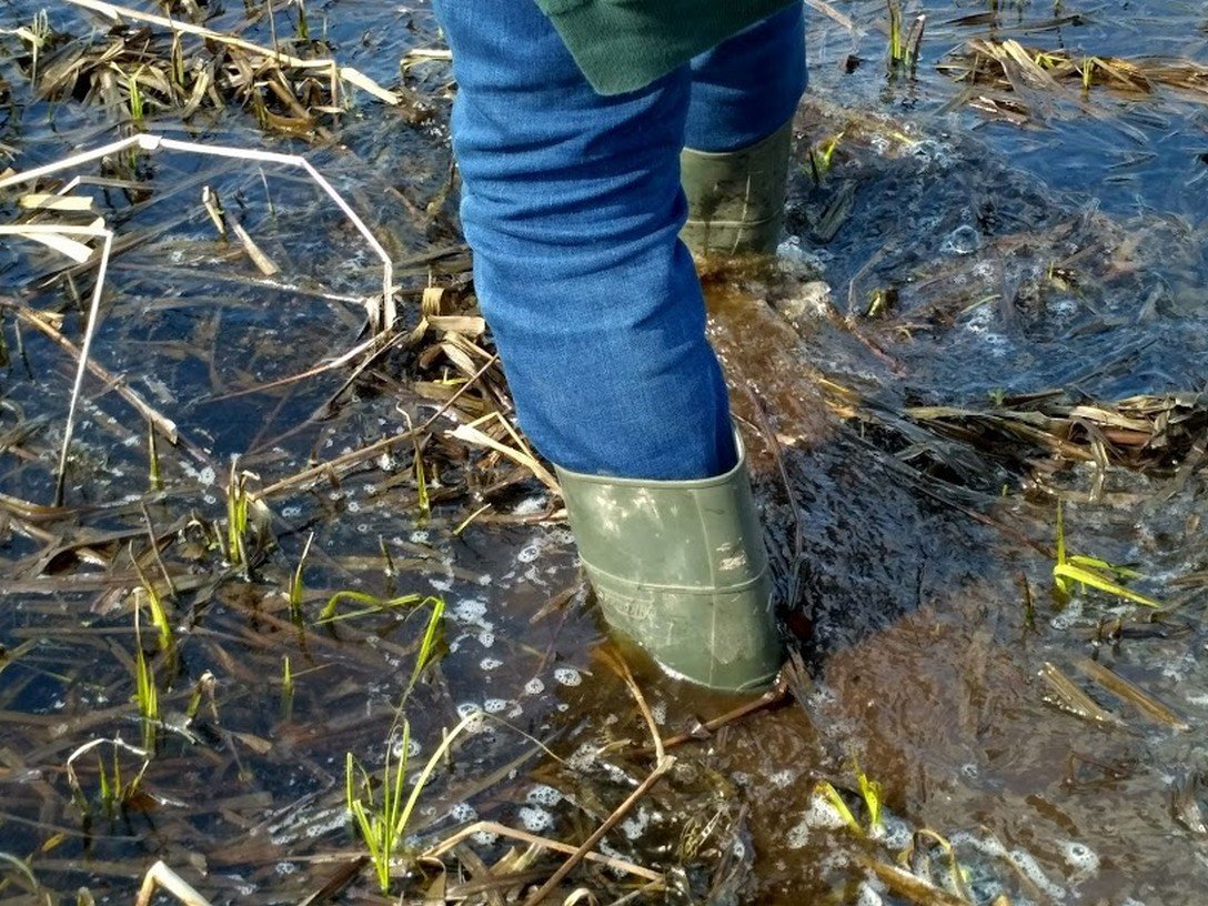 Деревянный настил, по которому можно гулять даже босиком, начинается примерно через полкилометра. До него ведет обычная полевая дорожка. Если вы приезжаете летом, то скорее всего спокойно пройдете ее даже в кроссовках. Но вот осенью и особенно весной, чаще всего это невозможно. Дорогу сильно размывает и в некоторых местах приходится идти в воде по щиколотку, так что без сапог не обойтись.