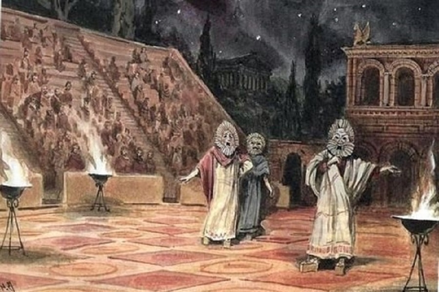 У первых трагедий был один актер, который замаскирован и носил маску, которая позволяла ему делать представления о богах. Позже актер разговаривал с руководителем хора, группой из 15 актеров, которые пели и танцевали, но не разговаривали.