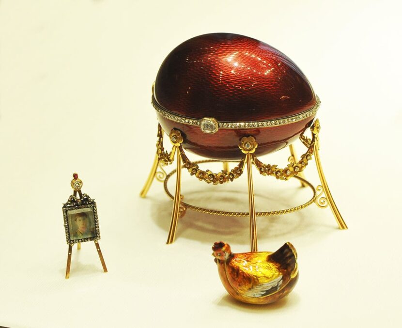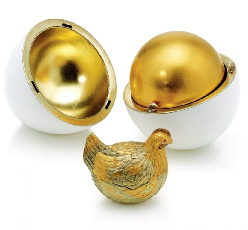 Этот артефакт вышел первым из рук мастера в 1885 г. Великолепное яйцо «Курочка» – первое в знаменитейшей серии пасхальных подарков из 54 шт. Белок яичка сделан из великолепнейшей белой эмали, желток мастерили из чистого золота, а внутри скорлупы прячется изящная птичка из цветного золота. Увы, музей Фаберже в Санкт-Петербурге обладает не полным набором. Изначально внутри курочки еще находилась корона с рубинами, которая в революционные годы затерялась.