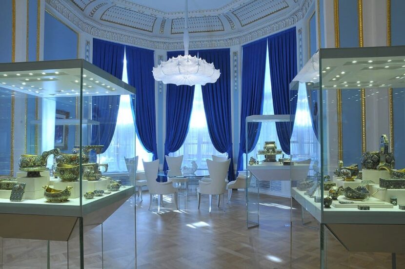 Красная комната посвящена русскому серебру, золотая-главным образом царским дарам, в то время как другие помещения посвящены фарфору, эмали, посуде и даже живописи, каменным скульптурам, портсигарам или русским иконам.