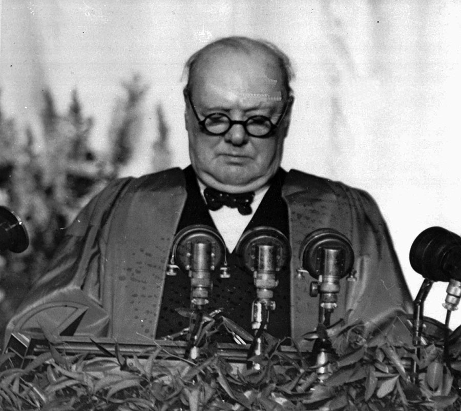 Черчилль, после поражения в переизбрании на пост премьер-министра в сорок пятом году, был приглашен в Вестминстерский колледж в Фултоне, штат Миссури, где он и произнес эту речь. Президент Гарри Трумэн присоединился к Уинстону на платформе и внимательно слушал его выступление.