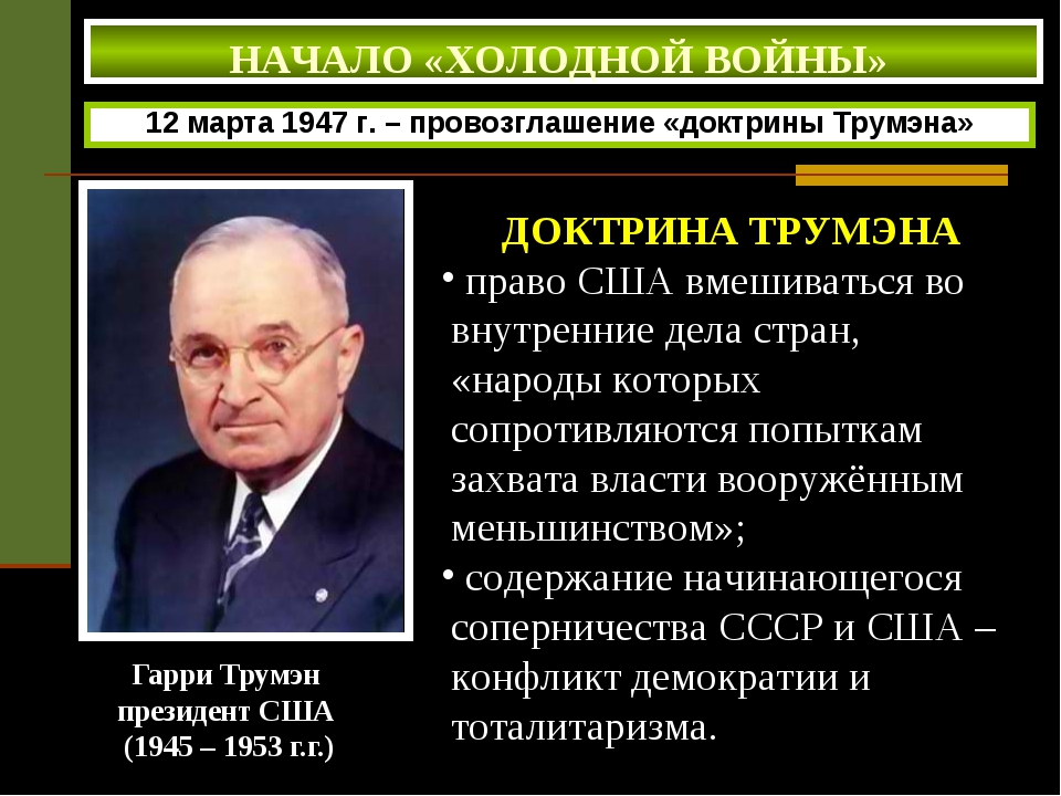 В 1947 году Гарри Трумэн сформулировал внешнеполитическую доктрину, предполагающую военную и экономическую поддержку некоммунистических режимов, вмешательство во внутренние дела других стран и сдерживание Советского Союза. Год спустя началась реализация плана Маршалла, подразумевающего кредитование западноевропейских государств и вытеснение коммунистов из их правительств. А в 1949 году был создан блок НАТО.