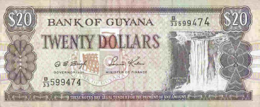 Гайанский доллар (G$, GYD), равный 100 центам. В обращении находятся банкноты номиналом в 1000, 500, 100 и 20 долларов (банкноты номиналом 1, 5 и 10 долларов выведены из обращения и обмениваются только Банком Гайаны), а также монеты номиналом в 10, 5 и 1 доллар.