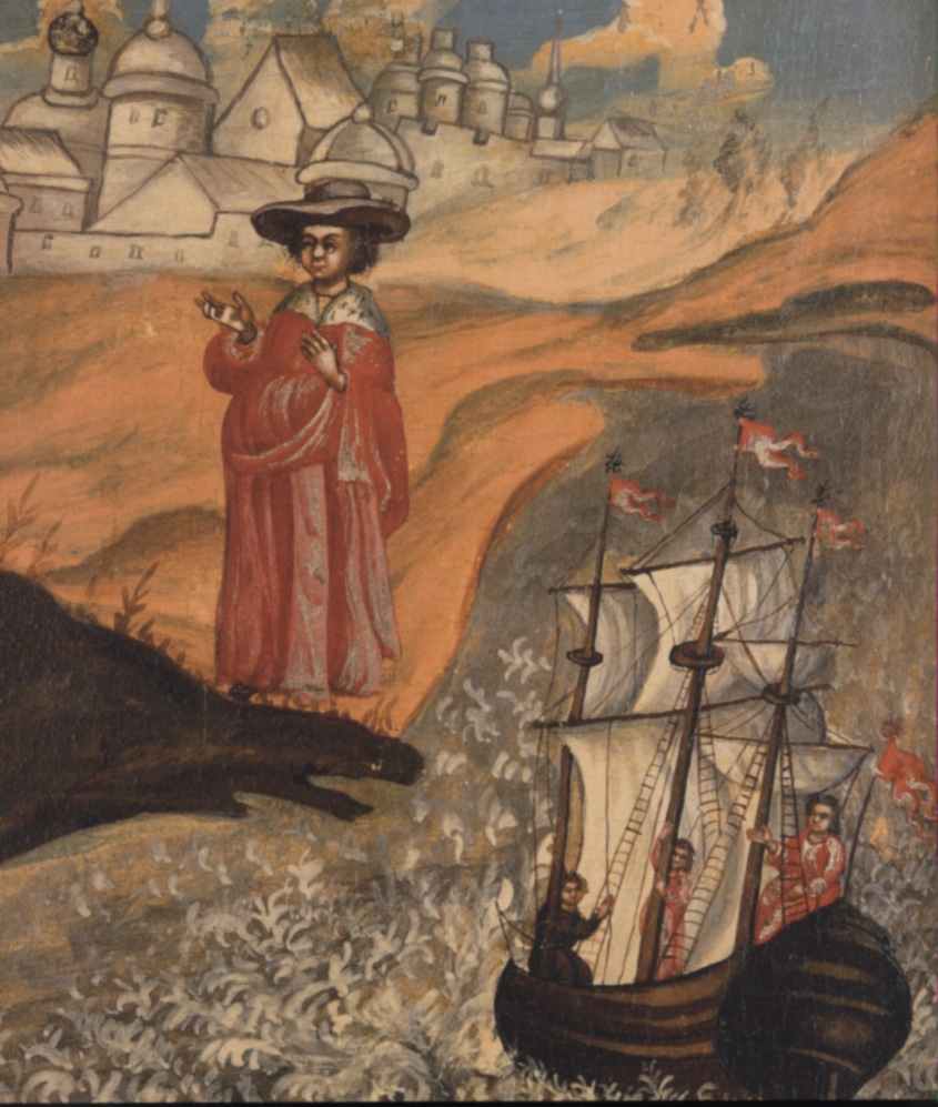 Прокопий Устюжский отбывает из немецкой земли в Новгород. Клеймо иконы