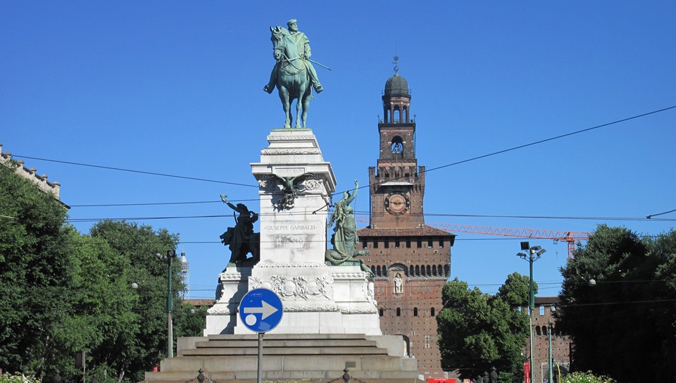 - В 1895 году был установлен еще один памятник Гарибальди в Милане, на Piazza Cairoli. Автором скульптуры стал Этторе Хименес (Ettore Ximenes), он выполнил ее из бронзы. Полководец изображен верхом на коне, а по обе стороны от него стоят Свобода, с мечом в ножнах и Революция со львом.