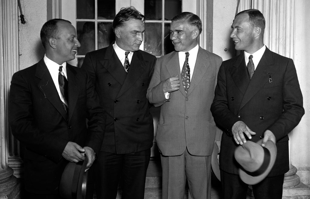 Байдуков, Чкалов, Трояновский и Беляков после приёма у президента США Рузвельта в Белом доме в 1937 г.