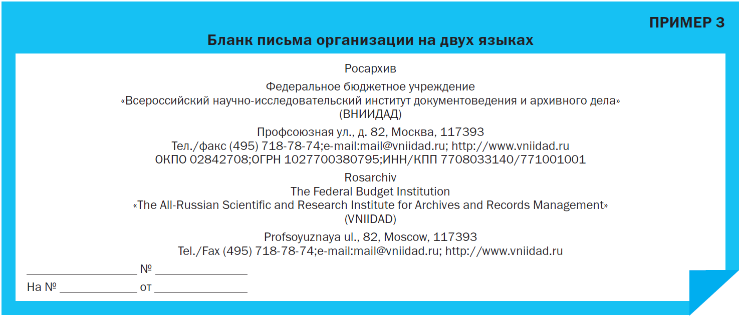 В ГОСТ Р 7.0.97-2016 также включено положение (не было в стандарте 2003 г., но было в стандартах 1990 и 1997 гг.) о том, что для переписки с иностранными корреспондентами используются бланки на двух языках – русском и английском или ином иностранном языке. Пример такого бланка – в приложении В.8 к стандарту (Пример 3).