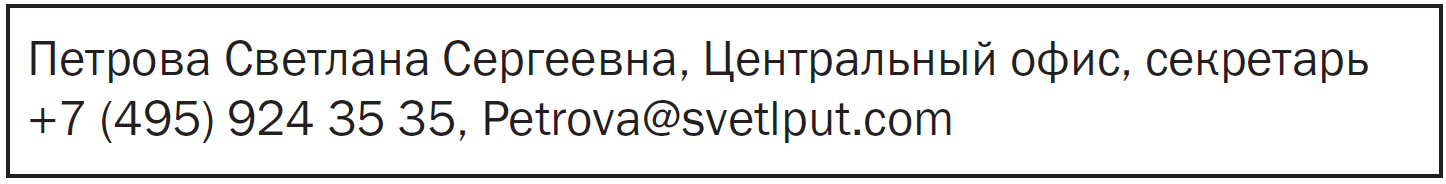 ■ Указываем адрес электронной почты. Новым элементом оформления реквизита «Адресат» является указание адреса электронной почты или номера телефона (факса), если письмо отправляется только по электронной почте или по факсимильной связи (без досылки по почте), например: