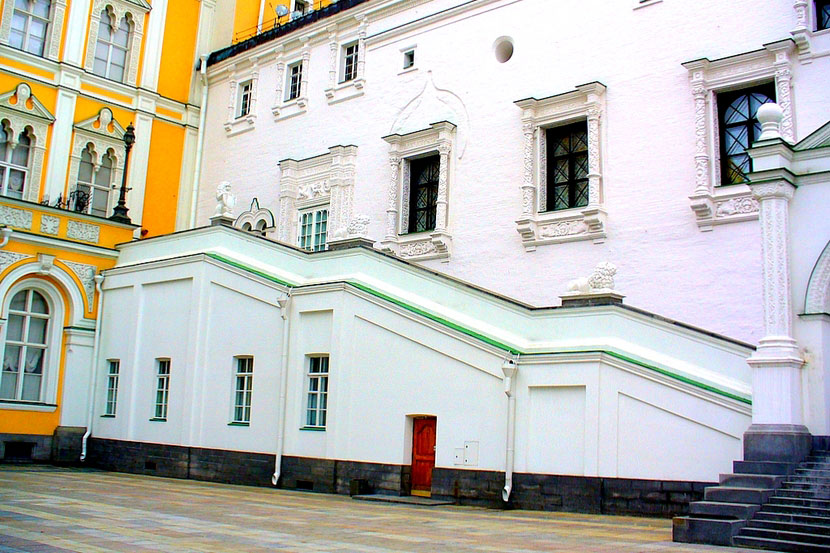 В 1491 г. на Соборной площади, слева от Успенского собора началось возведение нового светского здания — Большой палаты. В последствие она была переименована в Грановитую, что связано с наружной обработкой фасада граненым камнем. Подобная отделка была характерна для итальянского архитектурного стиля эпохи Возрождения. Располагалось здание перед приемным покоем Кремлевского дворца. Вблизи была выстроена Средняя палата и Верхнее крыльцо. На крыльце сходилось три лестницы, именуемые Красным крыльцом, Золотой решеткой и Благовещенской папертью.