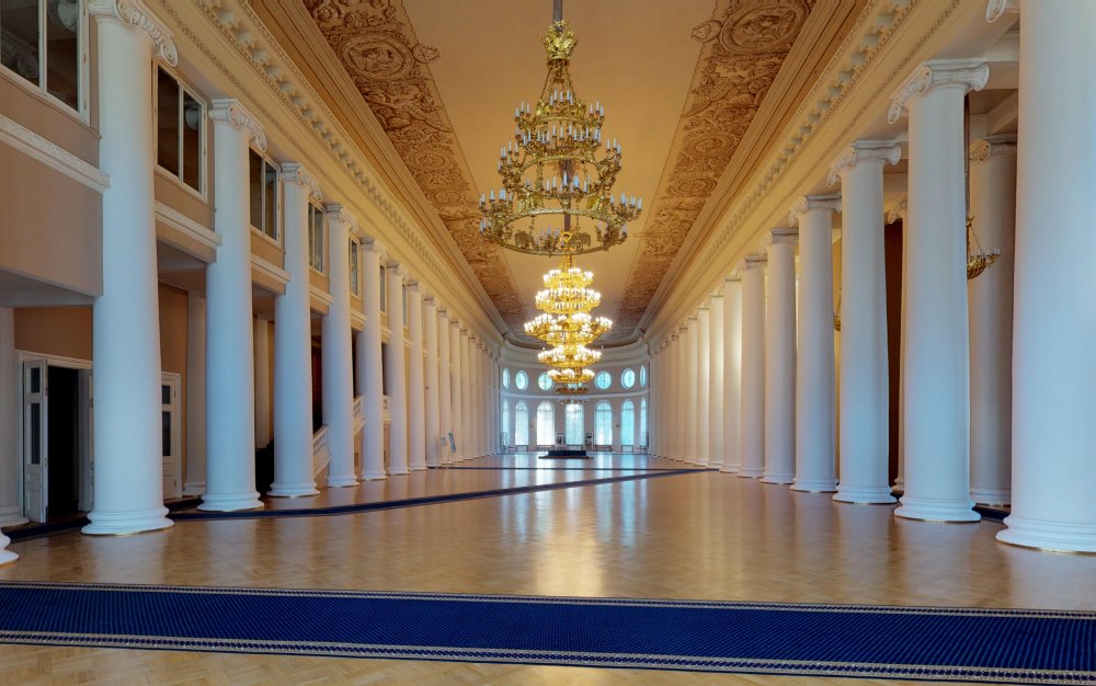 Двойная ажурная колоннада отделяет его от Зимнего сада. Это создает иллюзию бесконечности дворцовых покоев. В самом центре на постаменте возвышается статуя Екатерины II работы русского скульптора Ф.И. Шубина.