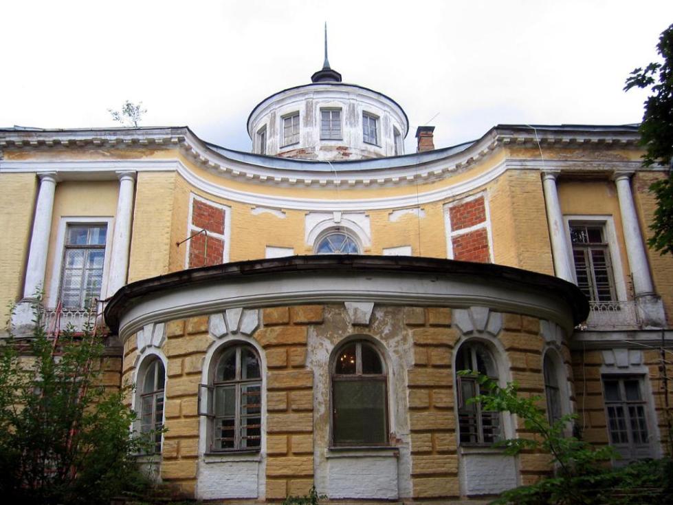 Стоит отметить, что фасад главного корпуса отличает дорический портик, а садового — полуротонда с балконом. Два флигеля небольшого размера увенчаны купольными башнями.