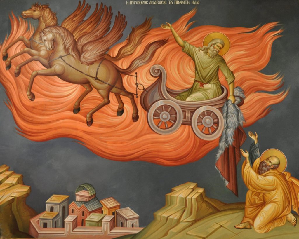 За свою пламенную ревность о Славе Божией пророк Илия был взят на Небо живым в огненной колеснице, которая окружена со всех сторон пламенем и запряжена четырьмя крылатыми конями.