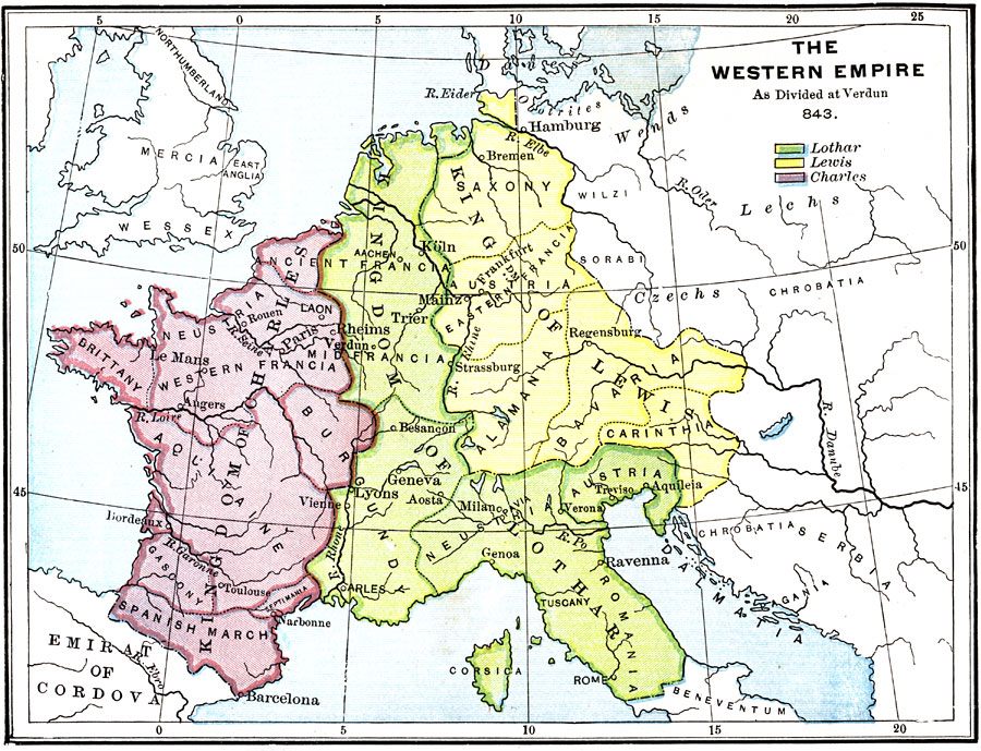 Ожесточённая борьба с Лотарем постепенно заканчивается: у обоих сторон иссякли силы и ресурсы для ведения войны. Спустя год, 11 августа 843 года, враждующие Каролинги пришли к соглашению в Лотарингии у Вердена. «Верденский раздел» предусматривал чёткое разграничение территорий, подвластным наследникам Людовика Благочестивого. Карлу Лысому достались земли будущего Западно-франкского королевства: современная Франция, часть Нидерландов и Испанская марка. Восточная половина империи Карла Великого досталась Людовику Немецкому: он был рождён в Баварии, вырос на землях будущего Германского королевства.