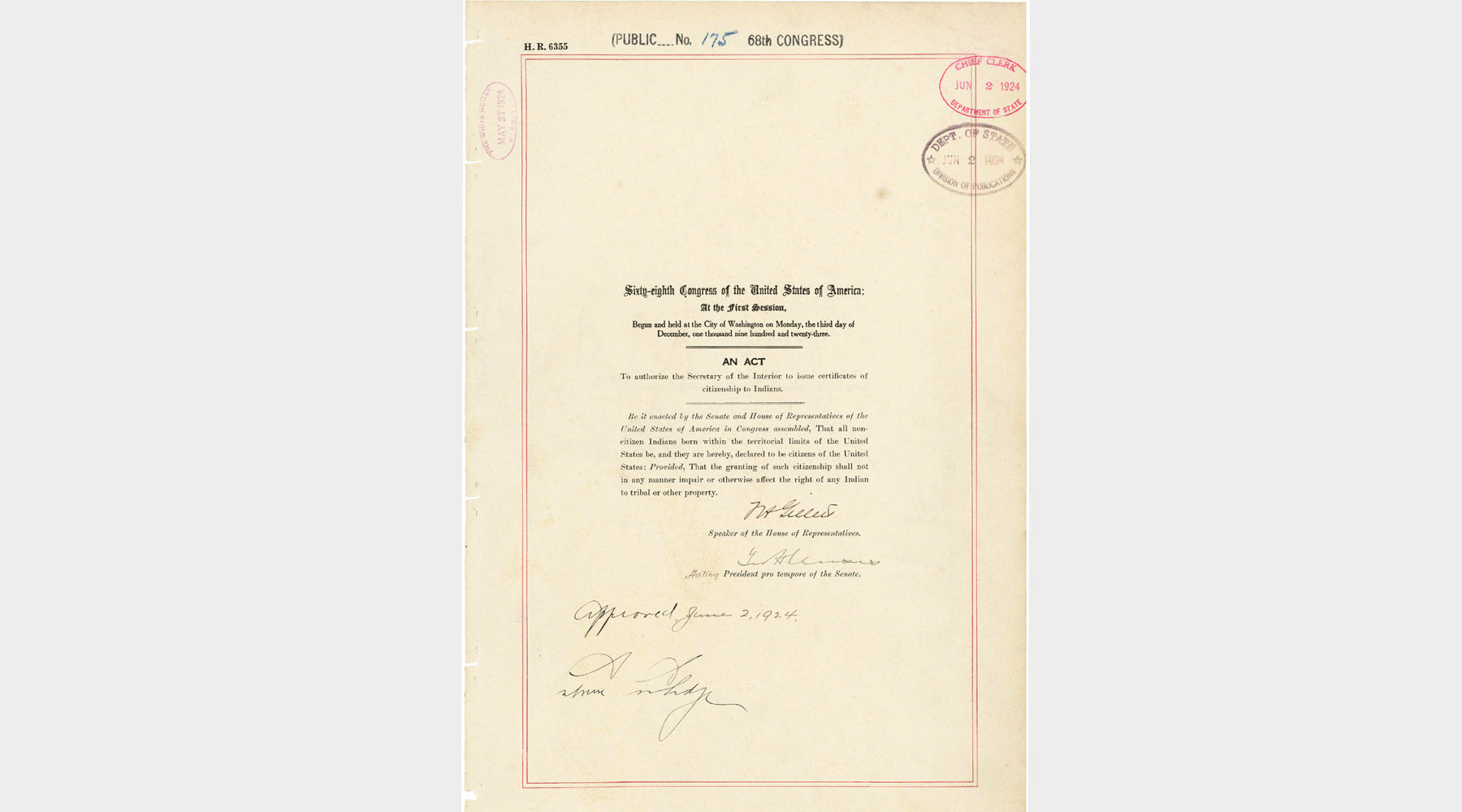 В 1924 году американский парламент по предложению конгрессмена Гомера Снайдера принял закон «О гражданстве индейцев». 2 июня его подписал президент Джон Калвин Кулидж — младший.