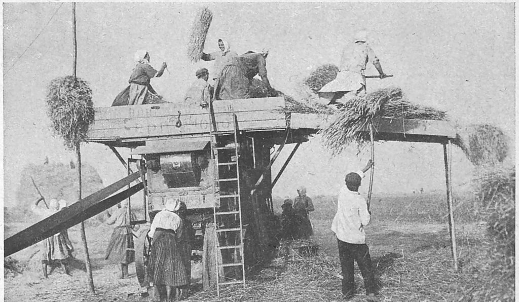 Работники колхоза у молотилки собирают урожай
