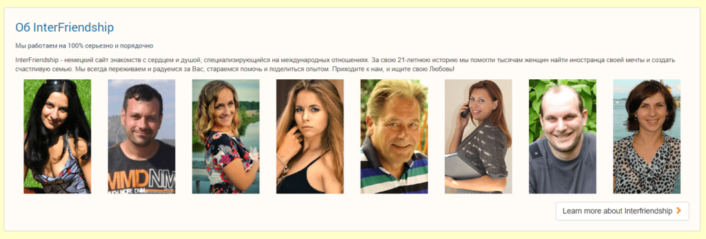 «InterFriendship» – международный сайт знакомств, созданный жителями Баварии. Он был основан в 1998 году. На официальном сайте сказано, что идея открыть подобный сервер пришла создателям после серии поездок в Россию. Они были очарованы русскими женщины и не понимали, почему у многих из них не ладится личная жизнь. Тогда у предпринимателей появилась задумка создать сайт знакомств, где россиянки смогут найти вторую половинку среди мужчин Западной Европы.