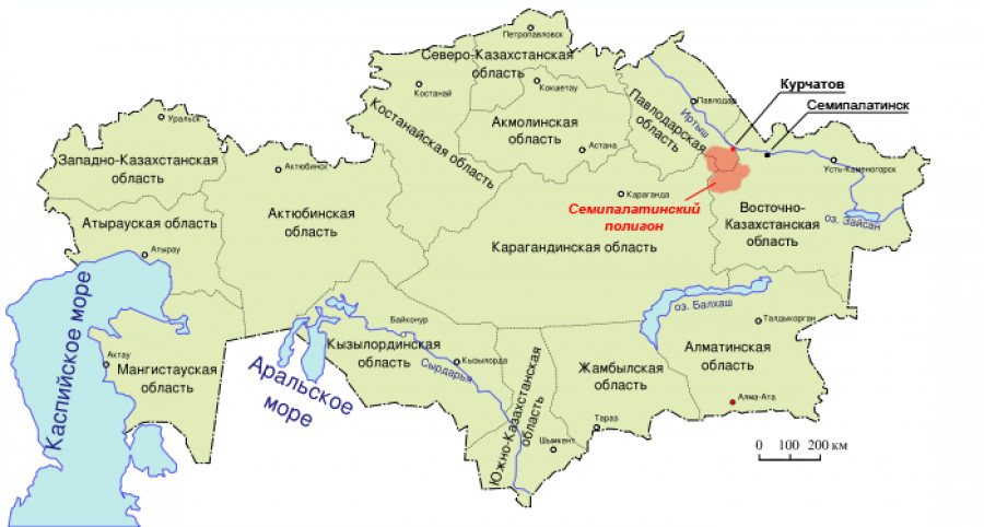 Семипалатинский испытательный полигон,на котором проводили первый ядерный взрыв и многие другие испытания ядерных устройств,растянулся на 175 км с севера на юг и 115 км — с запада на восток. От полигона до границы Алтайского края было приблизительно 150 км.